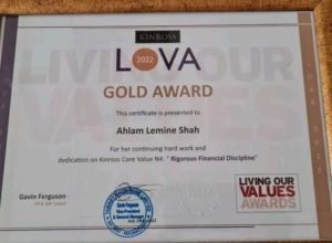 سلم المدير العام لشركة كينروس تازيازت الجائزة الذهبية للإنضباط المالي والجدارة وذلك لصالح مهندسة المعادن ، الموريتانية أحلام بنت محمد الامين الشاه.