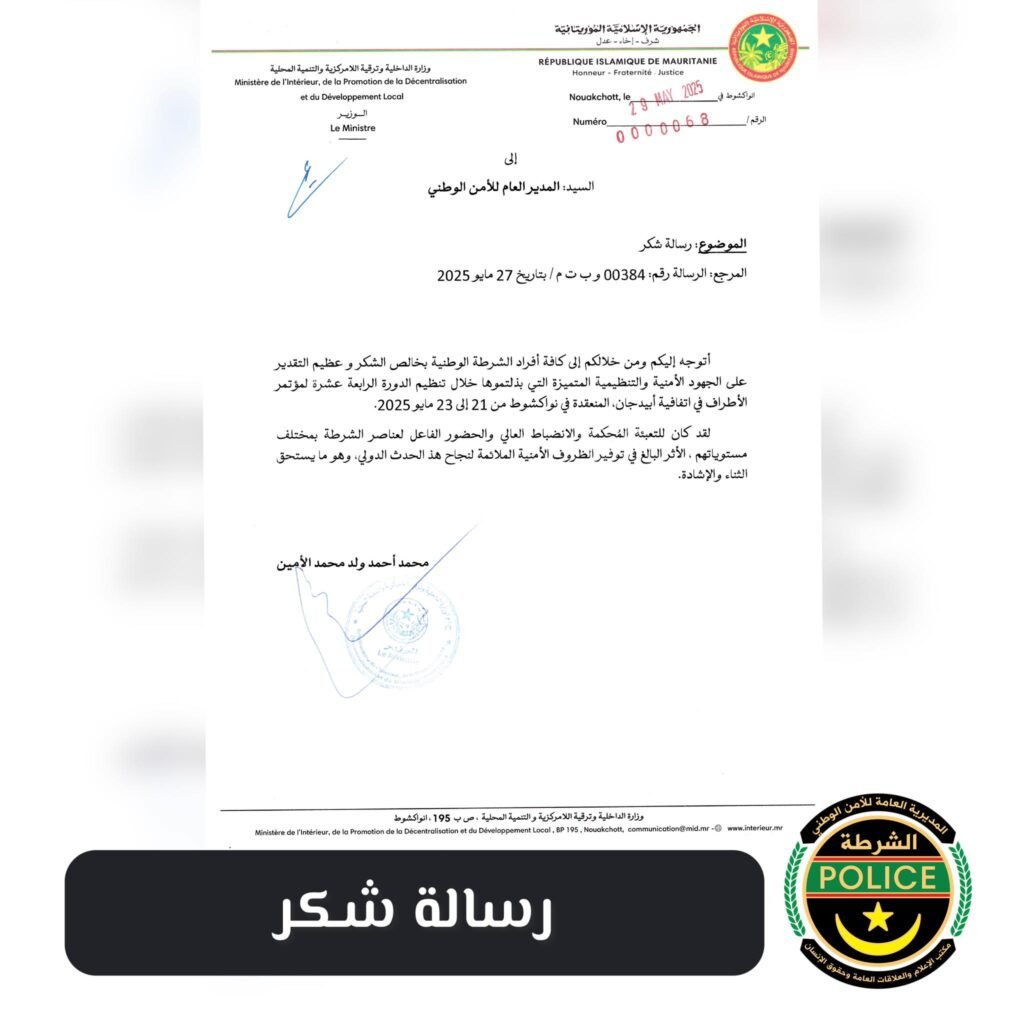 وجه وزير الداخلية وترقية اللامركزية و التنمية المحلية، السيد محمد أحمد ولد محمد الأمين، رسالة تهنئة إلى كافة أفراد الشرطة الوطنية بمناسبة تأمين الدورة الرابعة عشرة لمؤتمر الأطراف في اتفاقية أبيدجان، المنعقدة في نواكشوط من 21 الى 23 مايو 2025.