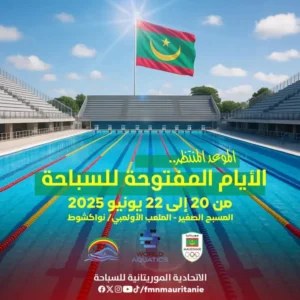 في إطار برنامجها السنوي لعام 2025، تُطلق الاتحادية الموريتانية للسباحة، بدعم من الاتحاد العالمي للرياضات المائية واللجنة الوطنية الأولمبية والرياضية الموريتانية، فعاليات “الأيام المفتوحة للسباحة”، وذلك في الفترة من 20 إلى 22 يونيو 2025، بالمسبح الصغير التابع للمركب الأولمبي في نواكشوط.
