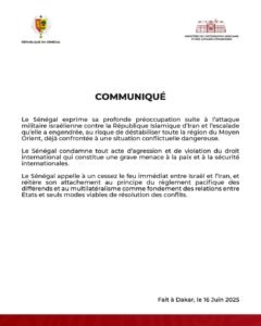 أعربت جمهورية السنغال، عن قلقها “العميق إزاء الهجوم العسكري الإسرائيلي على جمهورية إيران الإسلامية والتصعيد الذي أثاره”.