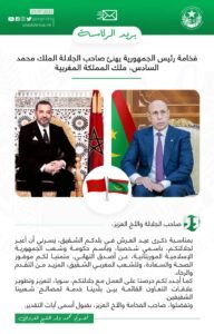 وجه رئيس الجمهورية محمد ولد الشيخ الغزواني برقية تهنئة الى أخيه الملك محمد السادس ملك المغرب بمناسبة عيد العرش ، واكد الغزواني للملك محمد السادس حرصه على تعزيز وتطوير وتيرة التعاون الثنائي بين البلدين الشقيقين موريتانيا والمغرب
