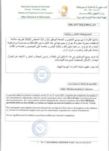 أعلنت الهيئة الوطنية للأرصاد الجوية أن الفترة ما بين يومي الخميس والجمعة، 21 و22 أغسطس 2025، ستشهد ظروفاً جوية غير مستقرة، تتخللها تساقطات مطرية معتبرة قد يتراوح مجموعها ما بين 20 و60 ملم، مصحوبة أحياناً برياح قوية تتراوح سرعتها بين 40 و100 كلم/س.
