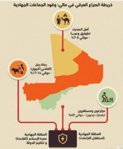 يكشف هذا الإنفوغرافيك عن الديناميكية المعقدة التي تغذي العنف في مالي. فالجماعات الجهادية الكبرى (مثل تحالف “نصرة الإسلام” التابع للقاعدة، و”تنظيم الدولة” داعش) لا تعتمد في تمددها على الأيديولوجيا فحسب، بل تبني استراتيجيتها أساساً على استغلال الشروخ العميقة والنزاعات القائمة على الموارد بين المكونات الرئيسية للبلاد: