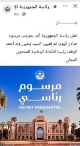 نواكشوط – أعلنت رئاسة الحمهورية  الخميس، تعيين يحيى ولد أحمد الوقف رئيسًا للأمانة الوطنية للمحتوى المحلي، وذلك بموجب مرسوم جمهوري نشر على الصفحة الرسمية للرئاسة.