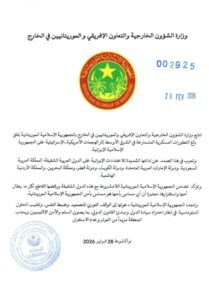 كما جددت موريتانيا دعوتها إلى التهدئة الفورية وضبط النفس، والعمل على تغليب الحلول الدبلوماسية في إطار احترام سيادة الدول ومبادئ القانون الدولي، بما يكفل الحفاظ على الأمن والاستقرار في المنطقة ويحول دون مزيد من التصعيد.