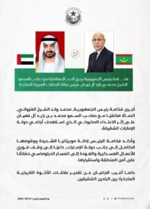 من جانبه، عبّر رئيس دولة الإمارات عن شكره وتقديره لرئيس الجمهورية على موقف موريتانيا الداعم وتضامنها مع بلاده في مواجهة هذه الاعتداءات.