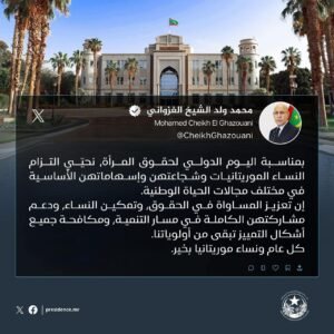واختتم فخامته رسالته متمنيًا لكل نساء موريتانيا دوام الصحة والتقدم والنجاح، قائلاً: “كل عام ونساء موريتانيا بخير”.