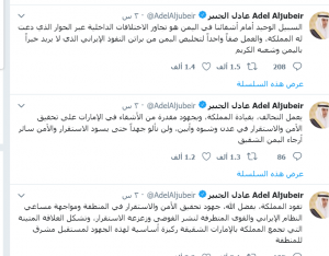ولفت في سلسلة تغريدات على حسابه الشخصي على “تويتر” إلى أن “المملكة تقود جهود تحقيق الأمن والاستقرار في المنطقة ومواجهة مساعي النظام الإيراني والقوى المتطرفة لنشر الفوضى وزعزعة الاستقرار، وتشكل العلاقة المتينة التي تجمع المملكة بالإمارات الشقيقة ركيزة أساسية لهذه الجهود لمستقبل مشرق للمنطقة”.
