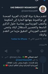 جاء ذلك عبر تغريدة بثتها السفارة الإماراتية في نواكشوط عبر حسابها الرسمي على شبكة التدوين الاجتماعية “تويتر”