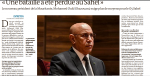 في مقابلة حصرية مع صحيفة Lemonde؛ هي المقابلة الثانية مع وسيلة إعلام خارجية دافع الرئيس الموريتاني محمد ولد الغزواني عن مجموعة الخمسة ودورها في المنطقة على الرغم من الهجمات المتكررة من قبل الجماعات الجهادية، لكنه طالب بالمزيد من الدعم من طرف المجتمع الدولي. شغل ولد الغزواني منصب رئيس أركان الجيش ثم وزير الدفاع قبل أن يتسلم الرئاسة في في 1 أغسطس من سلفه محمد ولد عبد العزيز (2009-2019) وقد ظهرت توترات مؤخراً بين الرجلين الذين صهرتهما بوتقة الأمن الموريتاني، لكن ولد الغزواني قلل من حجم هذه الأزمة.