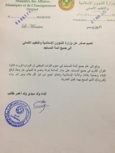 أصدر وزير الشؤون الاسلامية والتعليم الأصلي السيد الداه ولد سيدي ولد أعمر طالب تعميما لجميع المساجد المتواجدة على عموم التراب الوطني بتلاوة القران الكريم على مدار الساعة في بيوت الله بنية رفع البلاء على البلاد