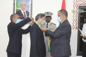 وشح معالي وزير الشؤون الخارجية والتعاون والموريتانيين في الخارج السيد اسماعيل ولد الشيخ باسم فخامة رئيس الجمهورية السيد محمد ولد الشيخ الغزواني واستنادا الى المهام الموكلة للوزارة اليوم الاثنين بمقر الوزارة سعادة السيد زهانغ جيانغو سفير جمهورية الصين الشعبية المعتمد لدى بلادنا بوسام كوماندور من نظام الاستحقاق الوطني بمناسبة انتهاء مهمته في البلاد.