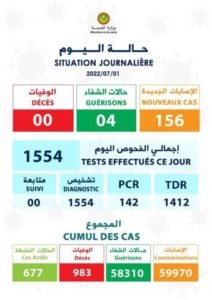 وتوصلت المصالح الصحية بهذه النتائج بعد إجراء 1554 فحصا جديدا جميعها للتشخيص بينها  1412 من الفحوص السريعة و 142 من فحوص الحمض النووي.