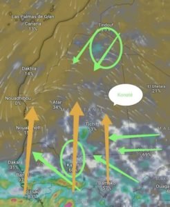 بدوره قال خبير الأرصاد الجوية عمر كوناتي التيار الجنوبي والجنوب الغربي بدأ اليوم يسطر على الوضعية المناخية العامة وهو ما يتوقع أن تتنج عنه بعض السحب الركامية على تيرس زمور وآدرار وإنشيري في نفس الوقت الذي بدات العاصفة الرعدية متعددة الخلية الكبيرة تتحرك نحو أرض الوطن وقد تصل بعد ساعات قليلة بحول الله وقوته ويتوقع أن تكون هناك امطار مهمة على الحوضين ولعصابة وكيدي ماغة وگورگول وتكانت ولبراكنة والترارزة بما فيها انواكشوط