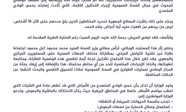 بيان صحفي من وزارة الصحة: استقبلت مصلحة الحالات المستعجلة بمركز الاستطباب الجهوي في روصو، يوم أمس الجمعة، مواطنا قادما من إحدى دول الجوار، كان يعاني من أعراض حمى نزيفية متقدمة. وقد تم فورا عزله بالمستشفى واتخاذ الإجراءات الاحترازية، كما تم سحب عينة منه وإرسالها إلى المعهد الوطني للبحوث في مجال الصحة العمومية لإجراء التحاليل اللازمة، التي أكدت إصابته بحمى الوادي…